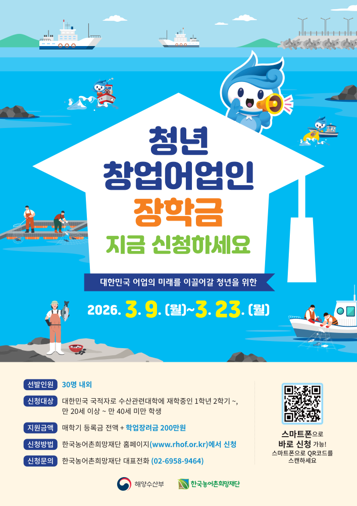 나. 장학금액: 매학기 등록금 전액 + 학업장려금 200만원 다. 지원조건 - 졸업 후, 해당 장학금 수혜 횟수에 해당하는 기간만큼(수혜 학기당 6개월) 어업 및 수산분야에 취·창업 - 재단이 정한 의무교육 필수 이수 및 보증보험 가입 라. 신청기간: 2026.3.9.(월) ~ 3.23.(월) (한국농어촌희망재단 홈페이지에서 신청) https://www.rhof.or.kr/sub/sub0101.jsp |