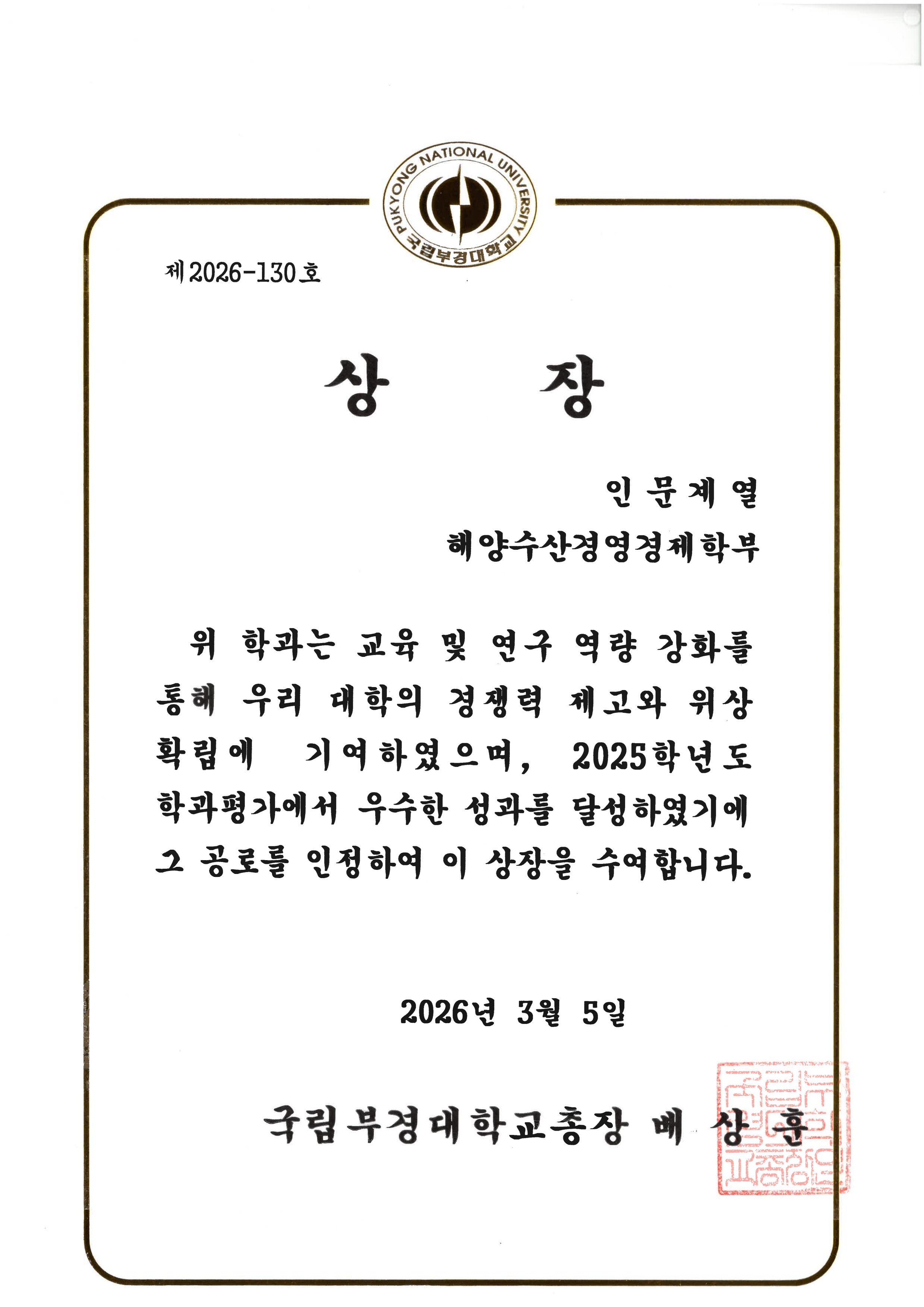 2025학년도 학과평가 인문계열 1위 달성 (해양수산경영경제학부)
